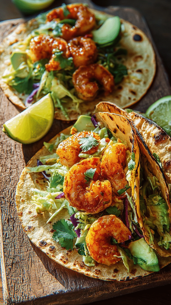 A delightful dish of shrimp nestled in warm corn tortillas, topped with crunchy cabbage, zesty lime, and fresh cilantro.