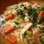 A comforting and creamy chicken soup filled with rice, vegetables, and fresh herbs.