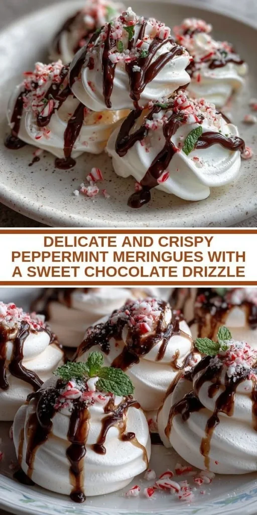 I carefully whipped the egg whites, watching them transform from a frothy cloud into glossy peaks, all while my heart raced with excitement. The brisk notes of peppermint filled my kitchen, mingling beautifully with the sweetness of sugar, just like the laughter of family gathered around a festive table. I couldn’t help but taste a bit of the chocolate drizzle as it warmed on the stove, its deep, rich flavor beckoning me. As I piped the meringue onto the baking sheet, I felt connected to all those moments spent in that special kitchen with my grandmother, sharing not just recipes, but love and joy through food. Now, I invite you to create this delicious memory with me.